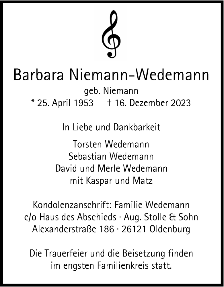 Hier finden Sie alle Traueranzeigen aus der Zeitung, die bisher für Barbara Niemann-Wedemann erschienen sind. Weitere Traueranzeigen, die in der Zeitung erscheinen, werden hier ebenfalls aufgelistet