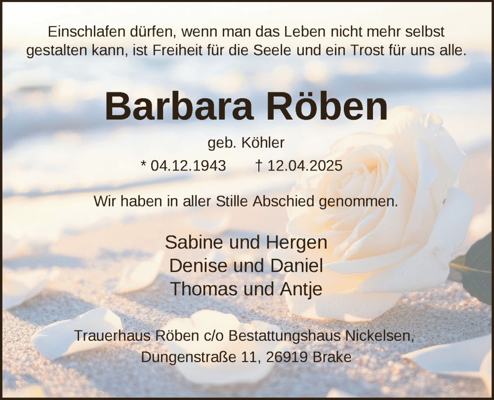 Hier finden Sie alle Traueranzeigen aus der Zeitung, die bisher für Barbara Röben erschienen sind. Weitere Traueranzeigen, die in der Zeitung erscheinen, werden hier ebenfalls aufgelistet