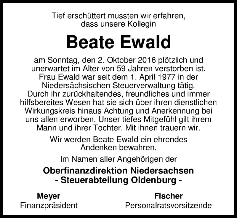 Hier finden Sie alle Traueranzeigen aus der Zeitung, die bisher für Beate Ewald erschienen sind. Weitere Traueranzeigen, die in der Zeitung erscheinen, werden hier ebenfalls aufgelistet