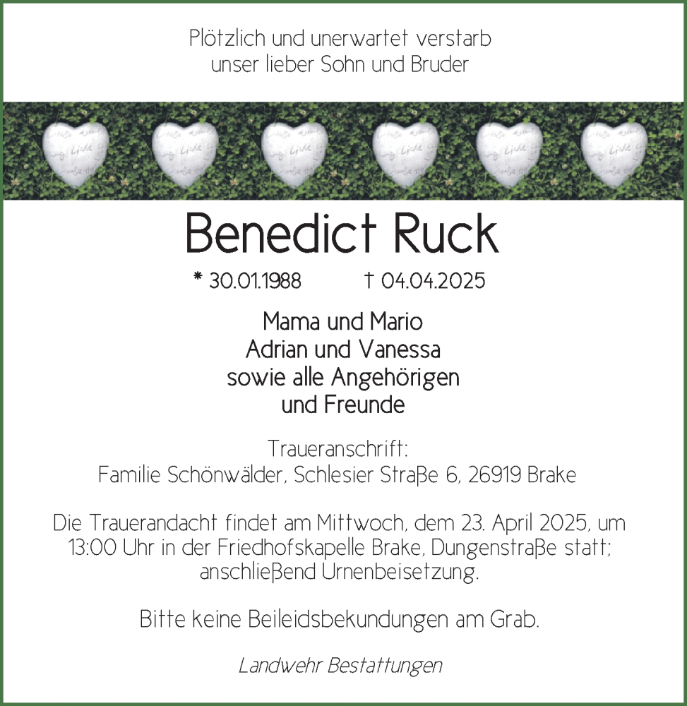 Hier finden Sie alle Traueranzeigen aus der Zeitung, die bisher für Benedict Ruck erschienen sind. Weitere Traueranzeigen, die in der Zeitung erscheinen, werden hier ebenfalls aufgelistet