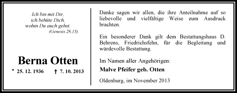 Hier finden Sie alle Traueranzeigen aus der Zeitung, die bisher für Berna Otten erschienen sind. Weitere Traueranzeigen, die in der Zeitung erscheinen, werden hier ebenfalls aufgelistet