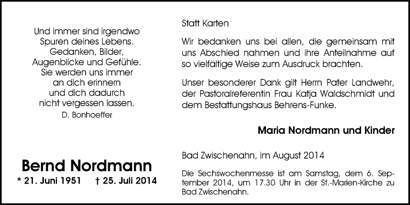 Hier finden Sie alle Traueranzeigen aus der Zeitung, die bisher für Bernd Nordmann erschienen sind. Weitere Traueranzeigen, die in der Zeitung erscheinen, werden hier ebenfalls aufgelistet