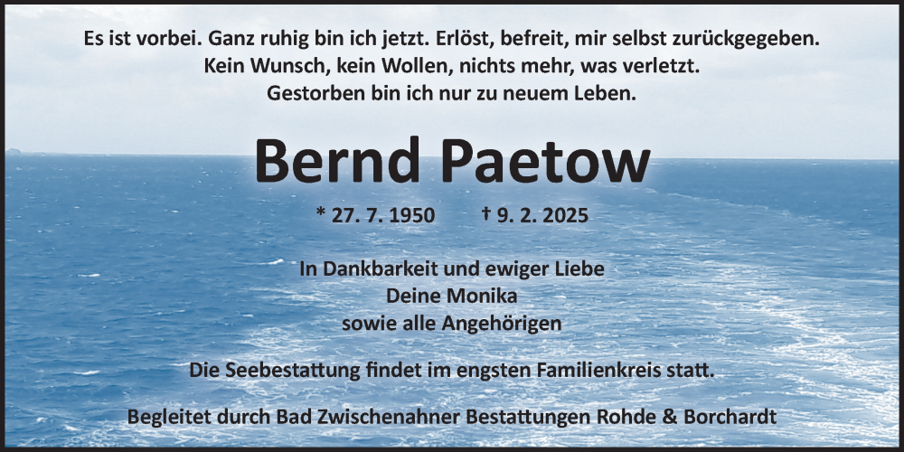 Hier finden Sie alle Traueranzeigen aus der Zeitung, die bisher für Bernd Paetow erschienen sind. Weitere Traueranzeigen, die in der Zeitung erscheinen, werden hier ebenfalls aufgelistet