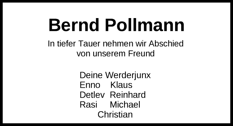 Hier finden Sie alle Traueranzeigen aus der Zeitung, die bisher für Bernd Pollmann erschienen sind. Weitere Traueranzeigen, die in der Zeitung erscheinen, werden hier ebenfalls aufgelistet