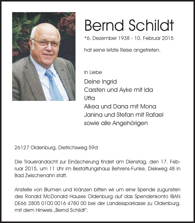 Hier finden Sie alle Traueranzeigen aus der Zeitung, die bisher für Bernd Schildt erschienen sind. Weitere Traueranzeigen, die in der Zeitung erscheinen, werden hier ebenfalls aufgelistet