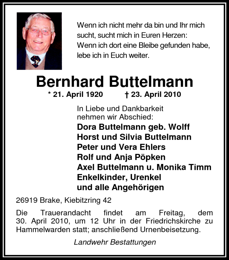 Hier finden Sie alle Traueranzeigen aus der Zeitung, die bisher für Bernhard Buttelmann erschienen sind. Weitere Traueranzeigen, die in der Zeitung erscheinen, werden hier ebenfalls aufgelistet