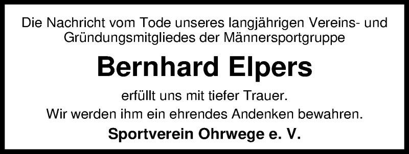 Hier finden Sie alle Traueranzeigen aus der Zeitung, die bisher für Bernhard Elpers erschienen sind. Weitere Traueranzeigen, die in der Zeitung erscheinen, werden hier ebenfalls aufgelistet