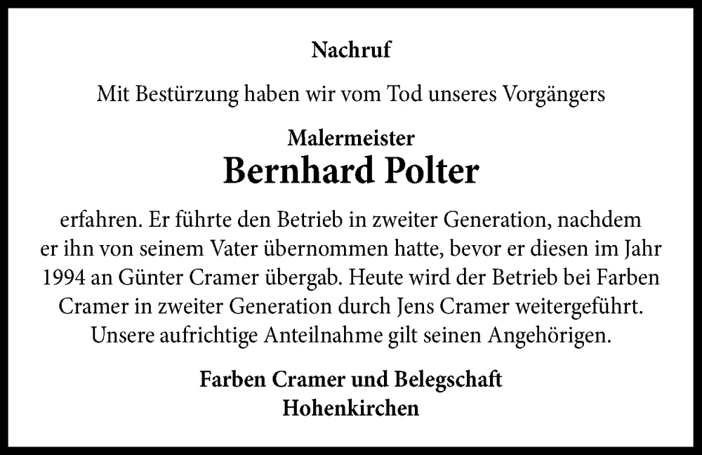 Hier finden Sie alle Traueranzeigen aus der Zeitung, die bisher für Bernhard Polter erschienen sind. Weitere Traueranzeigen, die in der Zeitung erscheinen, werden hier ebenfalls aufgelistet
