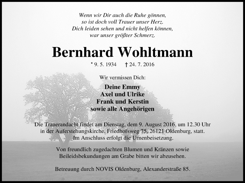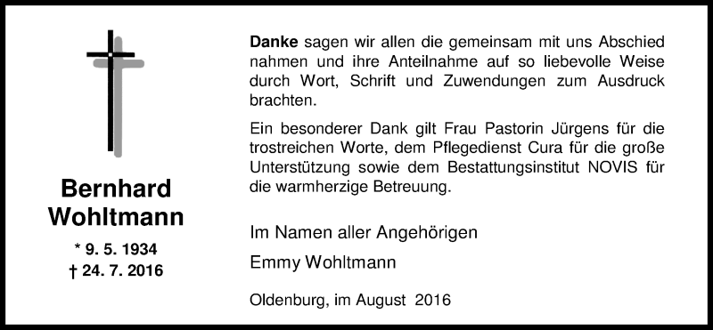 Hier finden Sie alle Traueranzeigen aus der Zeitung, die bisher für Bernhard Wohltmann erschienen sind. Weitere Traueranzeigen, die in der Zeitung erscheinen, werden hier ebenfalls aufgelistet