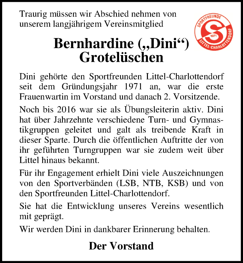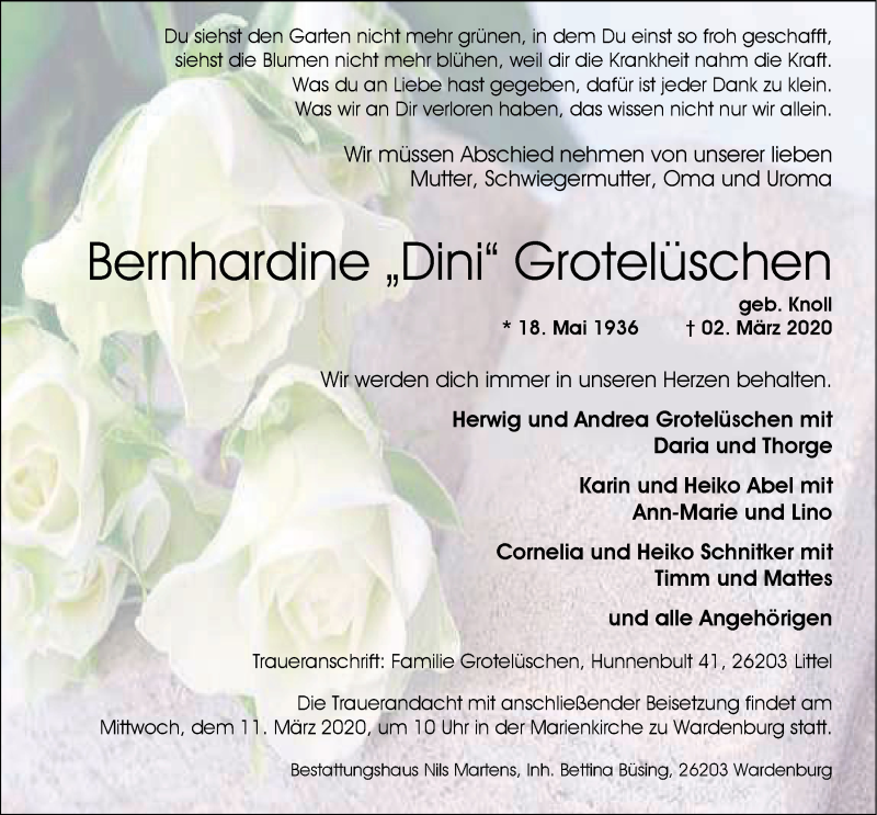 Hier finden Sie alle Traueranzeigen aus der Zeitung, die bisher für Bernhardine Grotelüschen erschienen sind. Weitere Traueranzeigen, die in der Zeitung erscheinen, werden hier ebenfalls aufgelistet