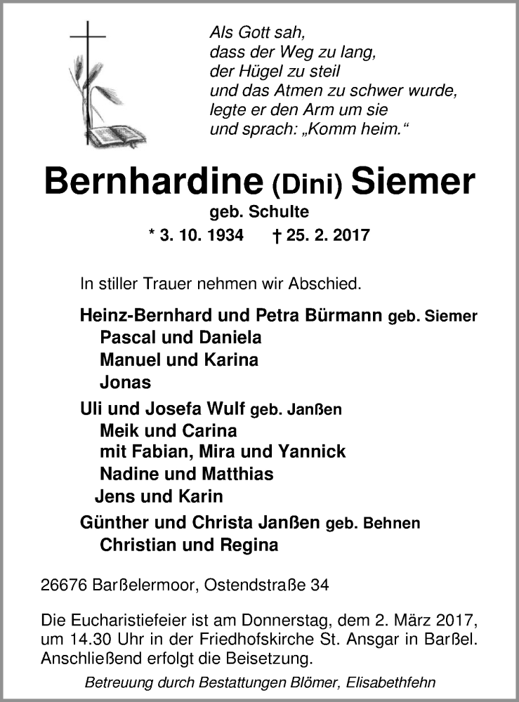 Hier finden Sie alle Traueranzeigen aus der Zeitung, die bisher für Bernhardine Siemer erschienen sind. Weitere Traueranzeigen, die in der Zeitung erscheinen, werden hier ebenfalls aufgelistet