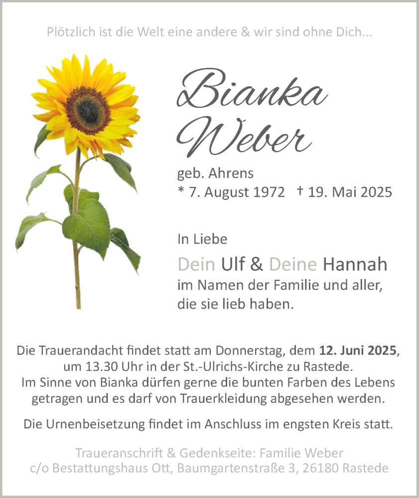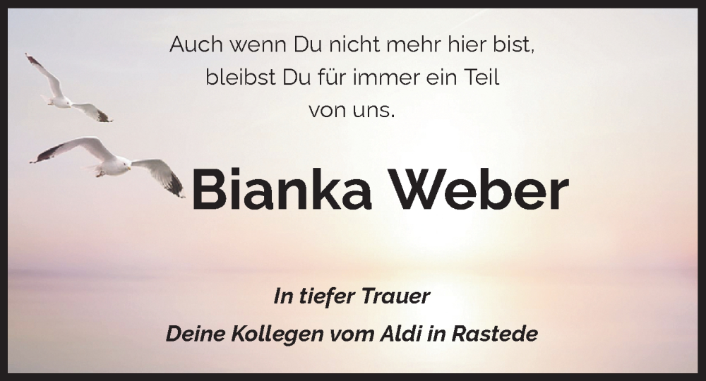 Hier finden Sie alle Traueranzeigen aus der Zeitung, die bisher für Bianka Weber erschienen sind. Weitere Traueranzeigen, die in der Zeitung erscheinen, werden hier ebenfalls aufgelistet