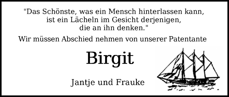 Hier finden Sie alle Traueranzeigen aus der Zeitung, die bisher für Birgit Grebe erschienen sind. Weitere Traueranzeigen, die in der Zeitung erscheinen, werden hier ebenfalls aufgelistet