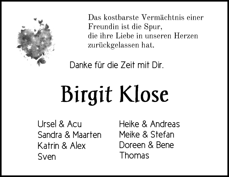 Hier finden Sie alle Traueranzeigen aus der Zeitung, die bisher für Birgit Klose erschienen sind. Weitere Traueranzeigen, die in der Zeitung erscheinen, werden hier ebenfalls aufgelistet