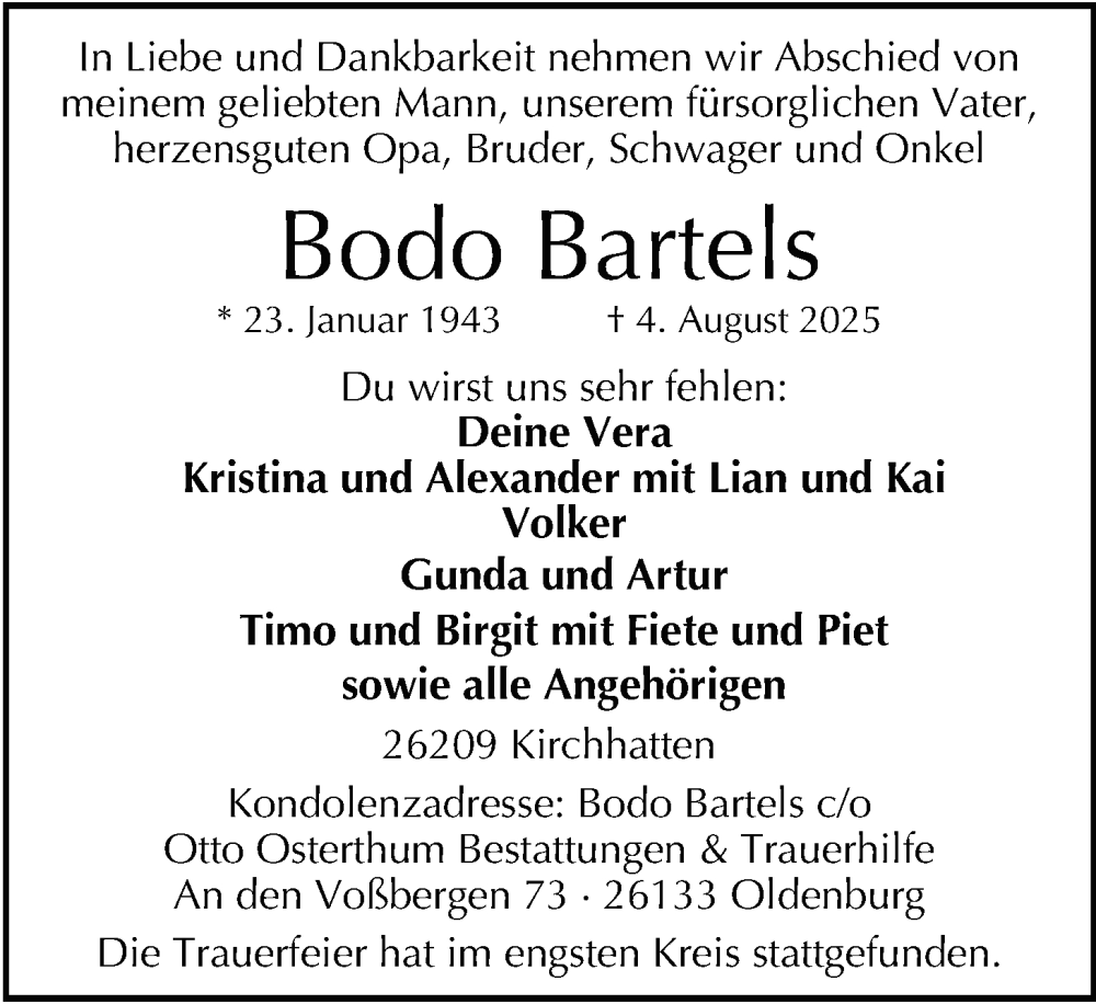 Hier finden Sie alle Traueranzeigen aus der Zeitung, die bisher für Bodo Bartels erschienen sind. Weitere Traueranzeigen, die in der Zeitung erscheinen, werden hier ebenfalls aufgelistet