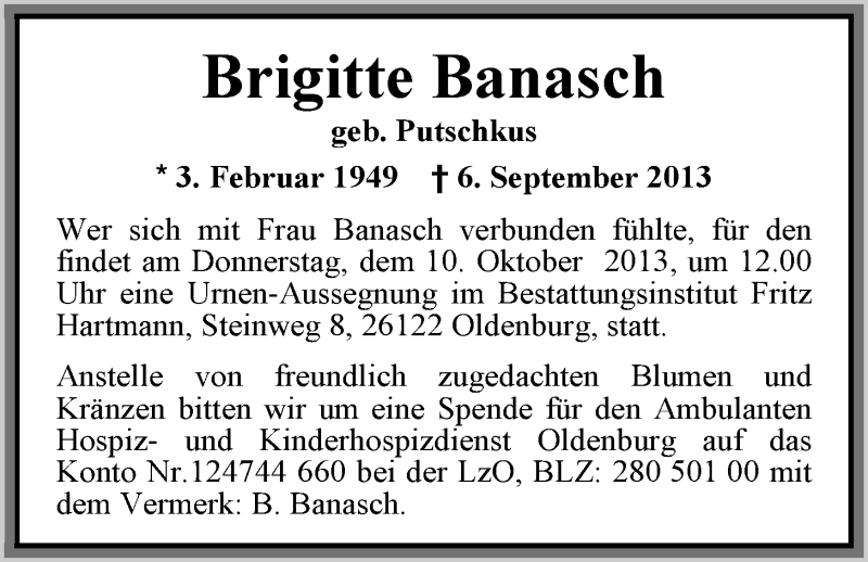 Hier finden Sie alle Traueranzeigen aus der Zeitung, die bisher für Brigitte Banasch erschienen sind. Weitere Traueranzeigen, die in der Zeitung erscheinen, werden hier ebenfalls aufgelistet