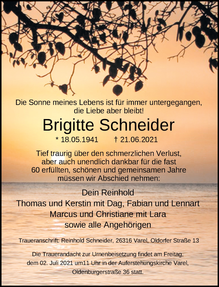 Hier finden Sie alle Traueranzeigen aus der Zeitung, die bisher für Brigitte Schneider erschienen sind. Weitere Traueranzeigen, die in der Zeitung erscheinen, werden hier ebenfalls aufgelistet