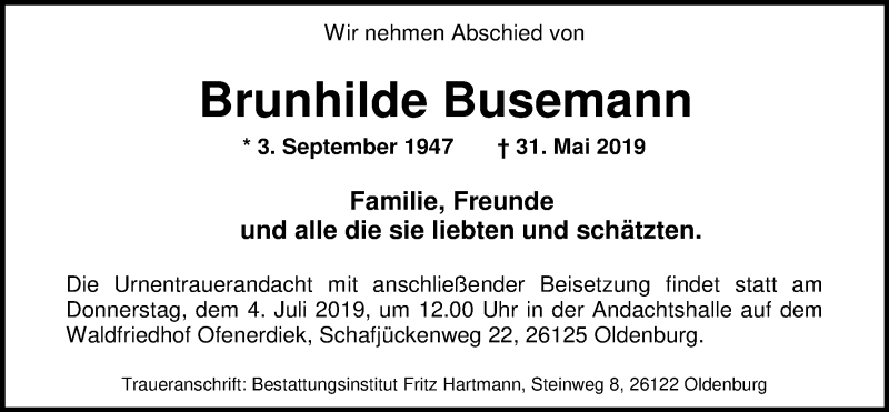 Hier finden Sie alle Traueranzeigen aus der Zeitung, die bisher für Brunhilde Busemann erschienen sind. Weitere Traueranzeigen, die in der Zeitung erscheinen, werden hier ebenfalls aufgelistet