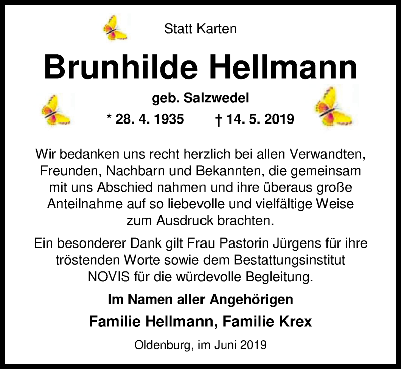 Hier finden Sie alle Traueranzeigen aus der Zeitung, die bisher für Brunhilde Hellmann erschienen sind. Weitere Traueranzeigen, die in der Zeitung erscheinen, werden hier ebenfalls aufgelistet