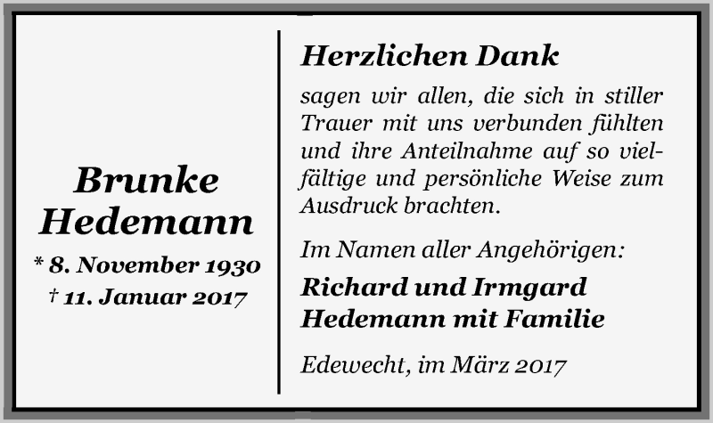 Hier finden Sie alle Traueranzeigen aus der Zeitung, die bisher für Brunke Hedemann erschienen sind. Weitere Traueranzeigen, die in der Zeitung erscheinen, werden hier ebenfalls aufgelistet