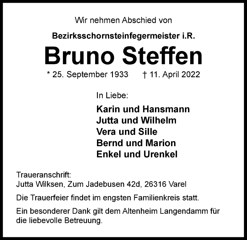Hier finden Sie alle Traueranzeigen aus der Zeitung, die bisher für Bruno Steffen erschienen sind. Weitere Traueranzeigen, die in der Zeitung erscheinen, werden hier ebenfalls aufgelistet