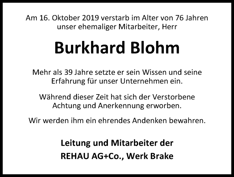 Hier finden Sie alle Traueranzeigen aus der Zeitung, die bisher für Burkhard Blohm erschienen sind. Weitere Traueranzeigen, die in der Zeitung erscheinen, werden hier ebenfalls aufgelistet