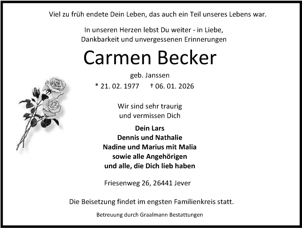 Hier finden Sie alle Traueranzeigen aus der Zeitung, die bisher für Carmen Becker erschienen sind. Weitere Traueranzeigen, die in der Zeitung erscheinen, werden hier ebenfalls aufgelistet