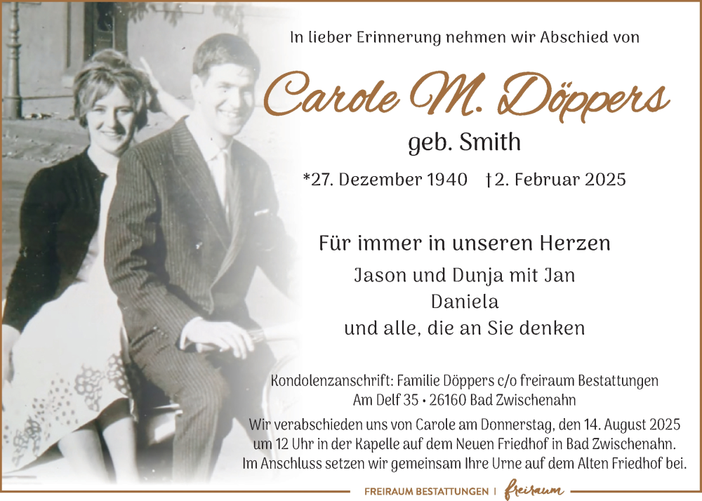Hier finden Sie alle Traueranzeigen aus der Zeitung, die bisher für Carole Döppers erschienen sind. Weitere Traueranzeigen, die in der Zeitung erscheinen, werden hier ebenfalls aufgelistet