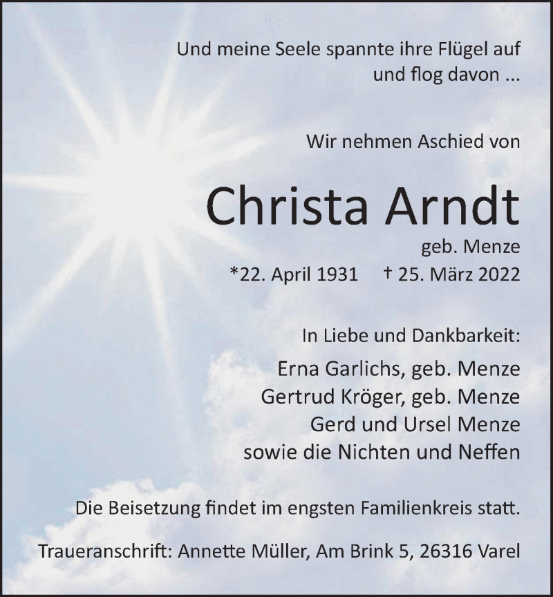 Hier finden Sie alle Traueranzeigen aus der Zeitung, die bisher für Christa Arndt erschienen sind. Weitere Traueranzeigen, die in der Zeitung erscheinen, werden hier ebenfalls aufgelistet