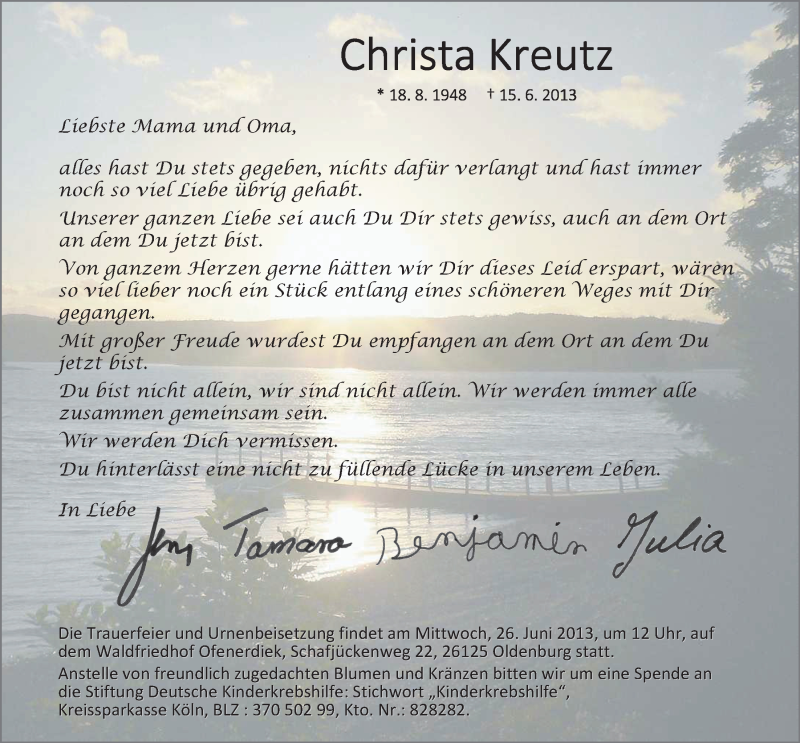 Hier finden Sie alle Traueranzeigen aus der Zeitung, die bisher für Christa Kreutz erschienen sind. Weitere Traueranzeigen, die in der Zeitung erscheinen, werden hier ebenfalls aufgelistet