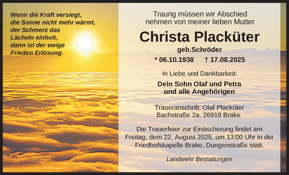 Hier finden Sie alle Traueranzeigen aus der Zeitung, die bisher für Christa Placküter erschienen sind. Weitere Traueranzeigen, die in der Zeitung erscheinen, werden hier ebenfalls aufgelistet