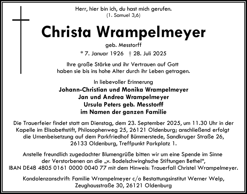Hier finden Sie alle Traueranzeigen aus der Zeitung, die bisher für Christa Wrampelmeyer erschienen sind. Weitere Traueranzeigen, die in der Zeitung erscheinen, werden hier ebenfalls aufgelistet