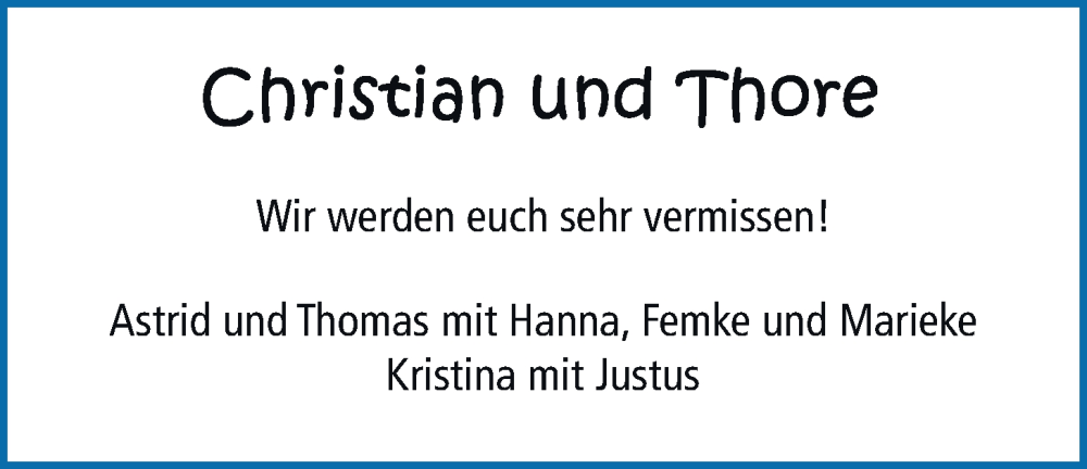 Hier finden Sie alle Traueranzeigen aus der Zeitung, die bisher für Christian und Thore Bruns erschienen sind. Weitere Traueranzeigen, die in der Zeitung erscheinen, werden hier ebenfalls aufgelistet