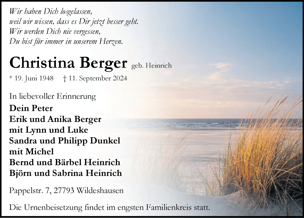 Hier finden Sie alle Traueranzeigen aus der Zeitung, die bisher für Christina Berger erschienen sind. Weitere Traueranzeigen, die in der Zeitung erscheinen, werden hier ebenfalls aufgelistet