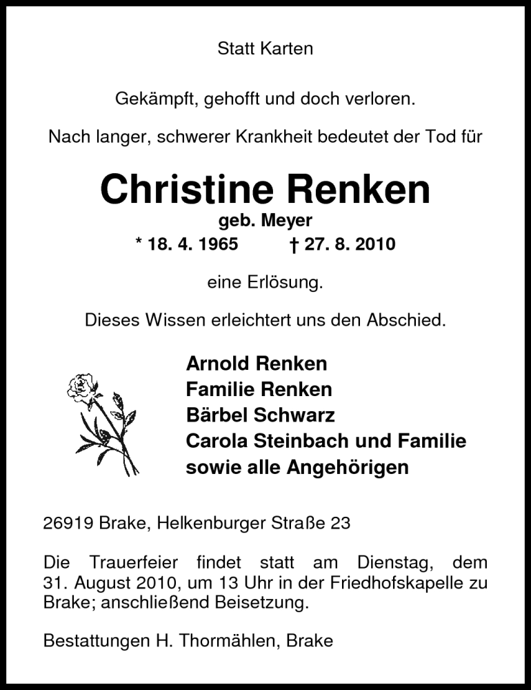 Hier finden Sie alle Traueranzeigen aus der Zeitung, die bisher für Christine Renken erschienen sind. Weitere Traueranzeigen, die in der Zeitung erscheinen, werden hier ebenfalls aufgelistet