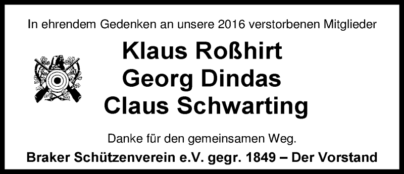 Hier finden Sie alle Traueranzeigen aus der Zeitung, die bisher für Claus Schwarting erschienen sind. Weitere Traueranzeigen, die in der Zeitung erscheinen, werden hier ebenfalls aufgelistet