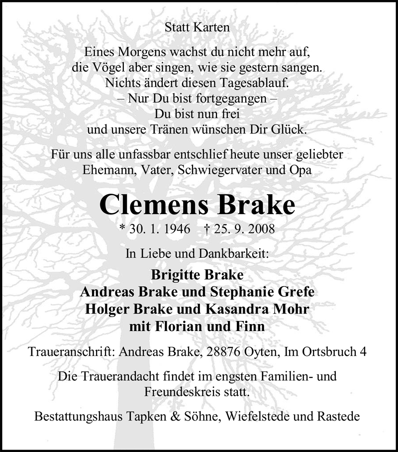 Hier finden Sie alle Traueranzeigen aus der Zeitung, die bisher für Clemens Brake erschienen sind. Weitere Traueranzeigen, die in der Zeitung erscheinen, werden hier ebenfalls aufgelistet