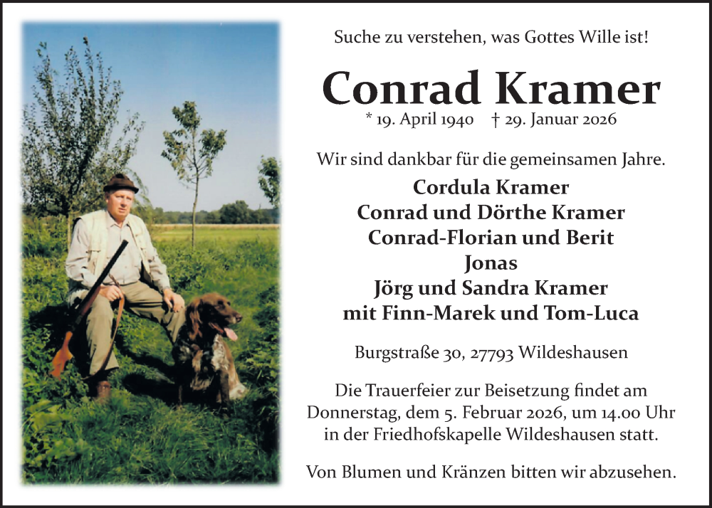 Hier finden Sie alle Traueranzeigen aus der Zeitung, die bisher für Conrad Kramer erschienen sind. Weitere Traueranzeigen, die in der Zeitung erscheinen, werden hier ebenfalls aufgelistet