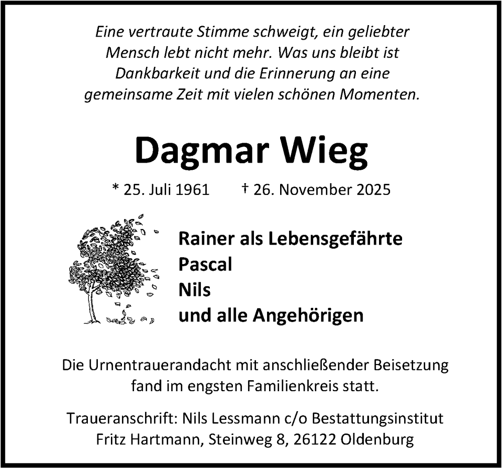 Hier finden Sie alle Traueranzeigen aus der Zeitung, die bisher für Dagmar Wieg erschienen sind. Weitere Traueranzeigen, die in der Zeitung erscheinen, werden hier ebenfalls aufgelistet
