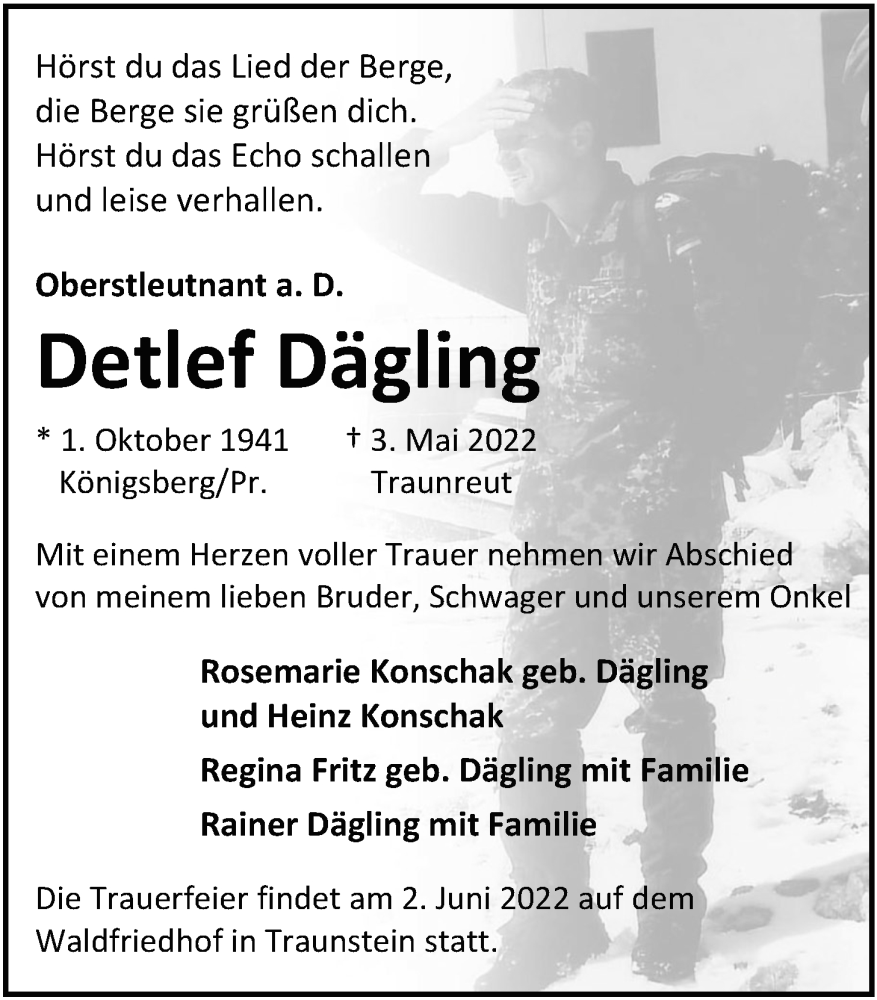 Hier finden Sie alle Traueranzeigen aus der Zeitung, die bisher für Detlef Dägling erschienen sind. Weitere Traueranzeigen, die in der Zeitung erscheinen, werden hier ebenfalls aufgelistet