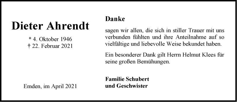 Hier finden Sie alle Traueranzeigen aus der Zeitung, die bisher für Dieter Ahrendt erschienen sind. Weitere Traueranzeigen, die in der Zeitung erscheinen, werden hier ebenfalls aufgelistet