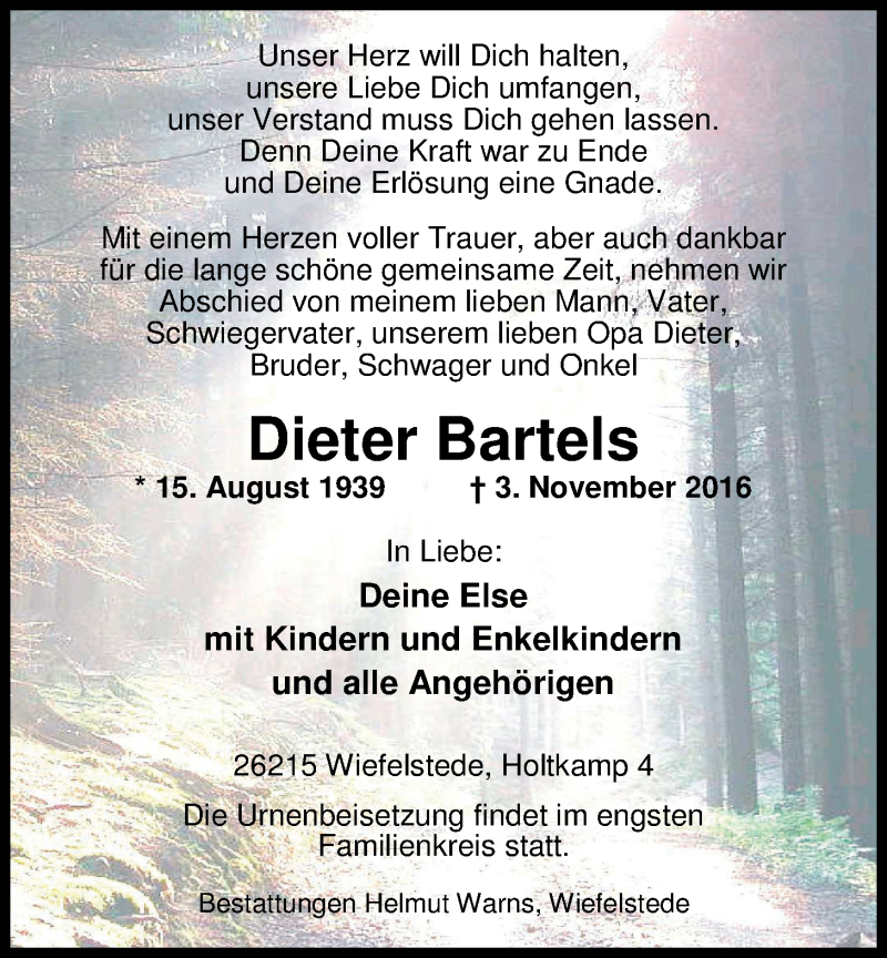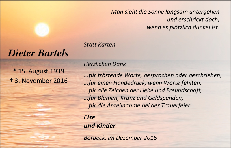 Hier finden Sie alle Traueranzeigen aus der Zeitung, die bisher für Dieter Bartels erschienen sind. Weitere Traueranzeigen, die in der Zeitung erscheinen, werden hier ebenfalls aufgelistet