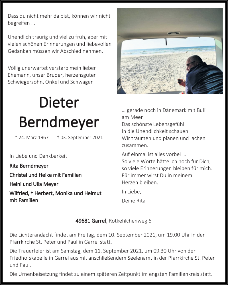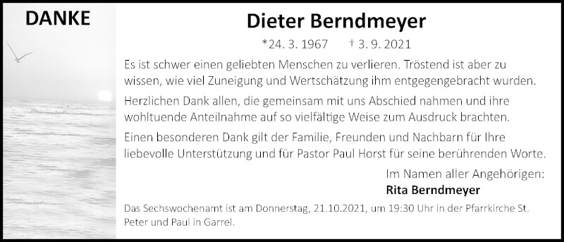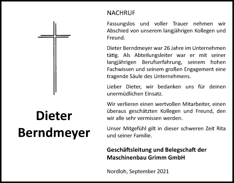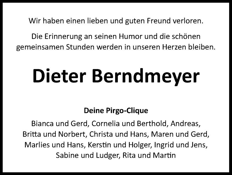 Hier finden Sie alle Traueranzeigen aus der Zeitung, die bisher für Dieter Berndmeyer erschienen sind. Weitere Traueranzeigen, die in der Zeitung erscheinen, werden hier ebenfalls aufgelistet