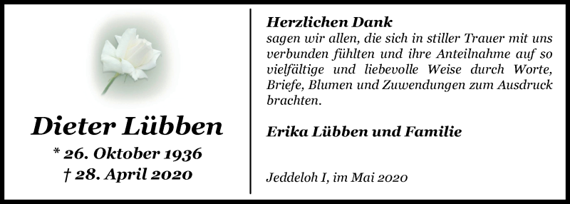 Hier finden Sie alle Traueranzeigen aus der Zeitung, die bisher für Dieter Lübben erschienen sind. Weitere Traueranzeigen, die in der Zeitung erscheinen, werden hier ebenfalls aufgelistet