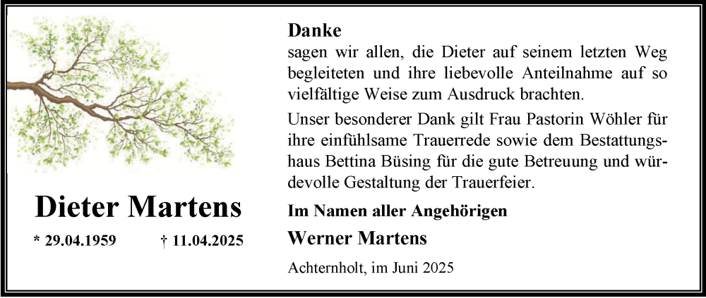 Hier finden Sie alle Traueranzeigen aus der Zeitung, die bisher für Dieter Martens erschienen sind. Weitere Traueranzeigen, die in der Zeitung erscheinen, werden hier ebenfalls aufgelistet