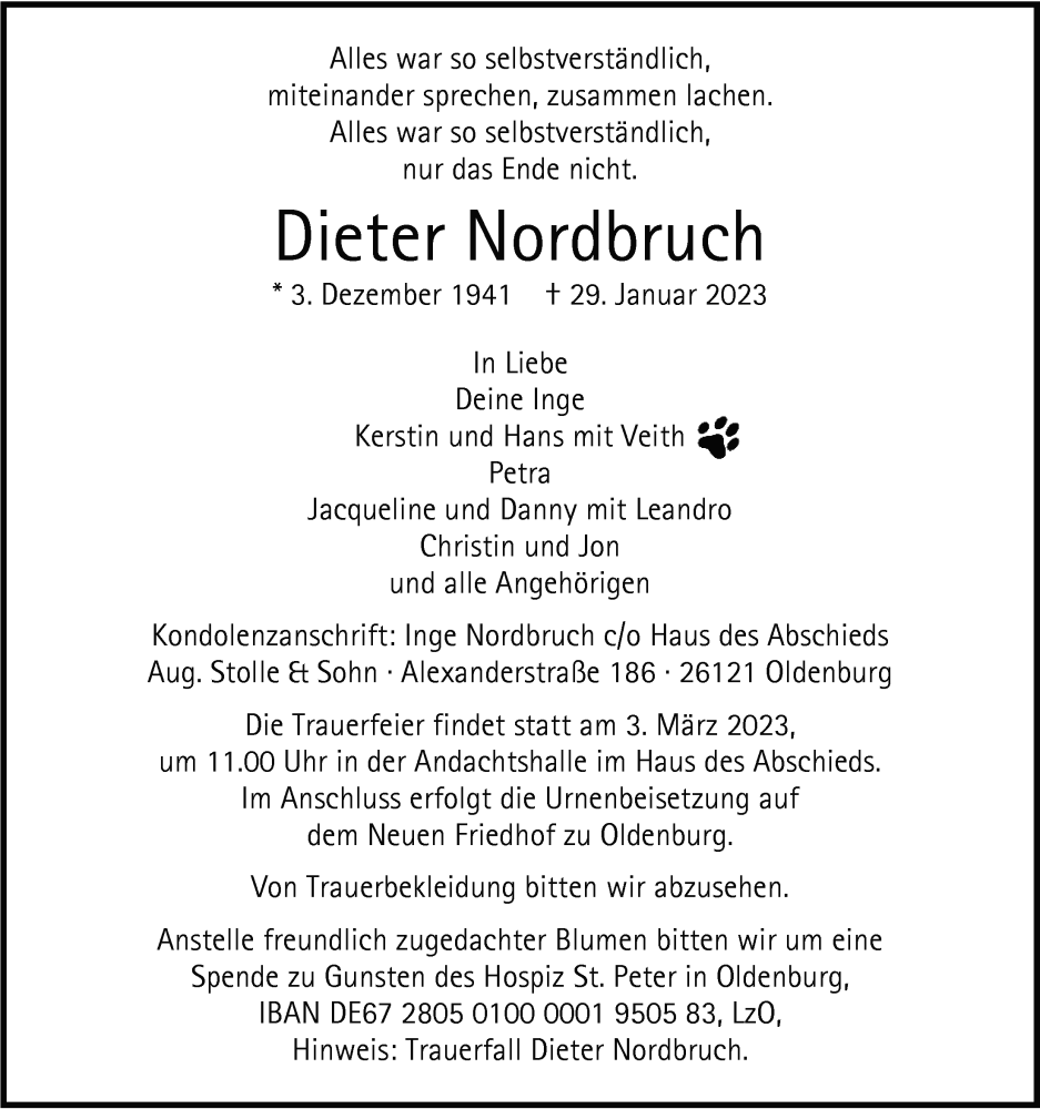 Hier finden Sie alle Traueranzeigen aus der Zeitung, die bisher für Dieter Nordbruch erschienen sind. Weitere Traueranzeigen, die in der Zeitung erscheinen, werden hier ebenfalls aufgelistet
