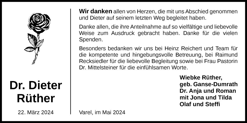Hier finden Sie alle Traueranzeigen aus der Zeitung, die bisher für Dieter Rüther erschienen sind. Weitere Traueranzeigen, die in der Zeitung erscheinen, werden hier ebenfalls aufgelistet