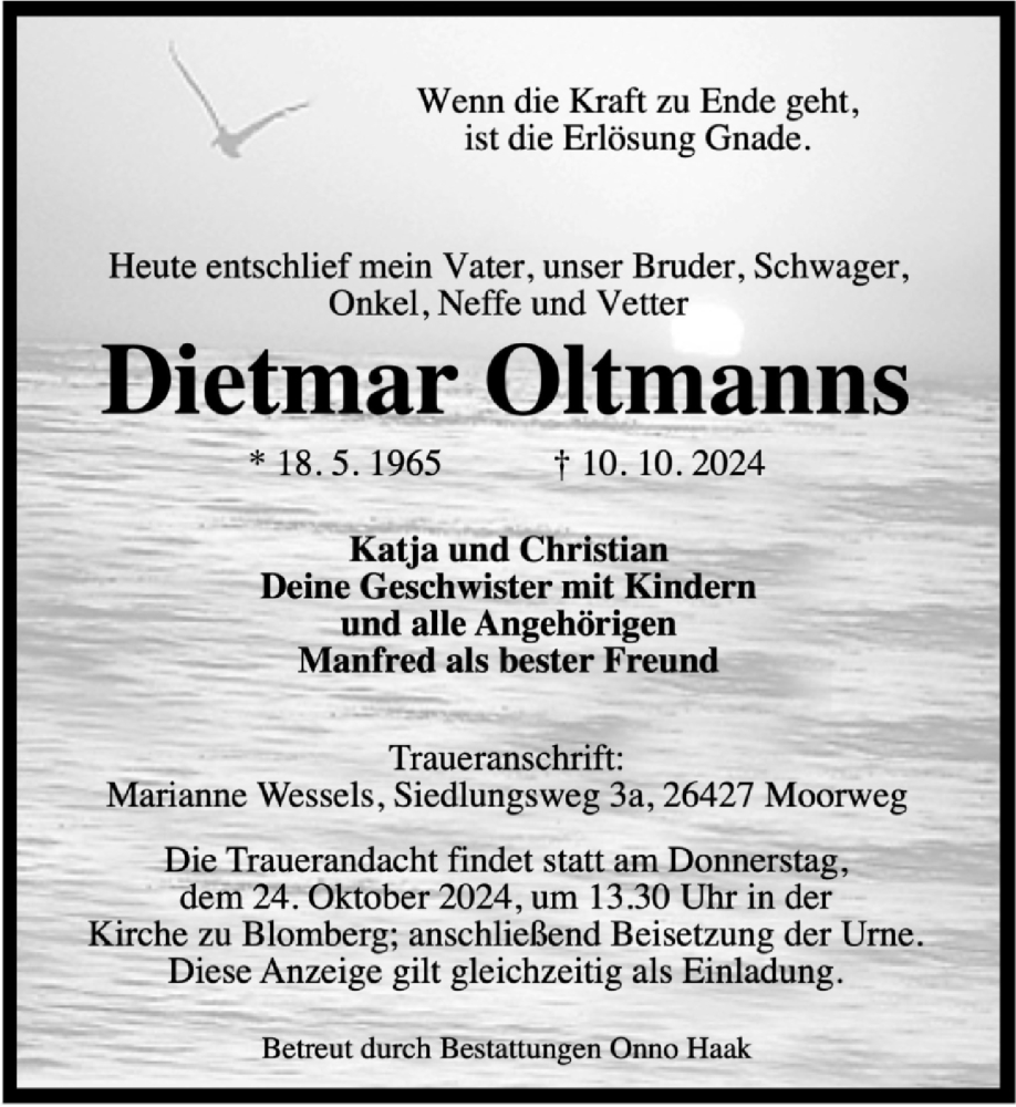 Hier finden Sie alle Traueranzeigen aus der Zeitung, die bisher für Dietmar Oltmanns erschienen sind. Weitere Traueranzeigen, die in der Zeitung erscheinen, werden hier ebenfalls aufgelistet