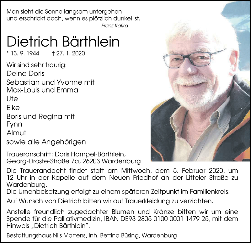 Hier finden Sie alle Traueranzeigen aus der Zeitung, die bisher für Dietrich Bärthlein erschienen sind. Weitere Traueranzeigen, die in der Zeitung erscheinen, werden hier ebenfalls aufgelistet