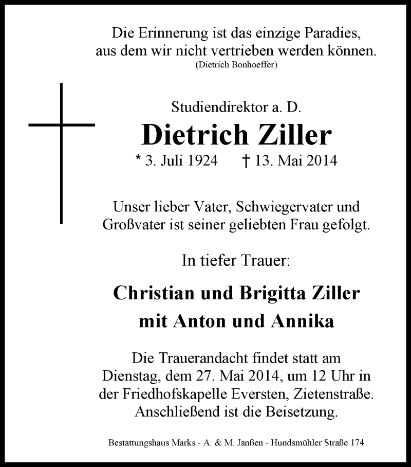 Hier finden Sie alle Traueranzeigen aus der Zeitung, die bisher für Dietrich Ziller erschienen sind. Weitere Traueranzeigen, die in der Zeitung erscheinen, werden hier ebenfalls aufgelistet